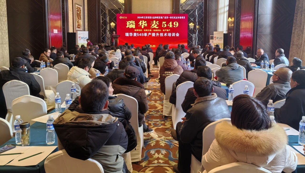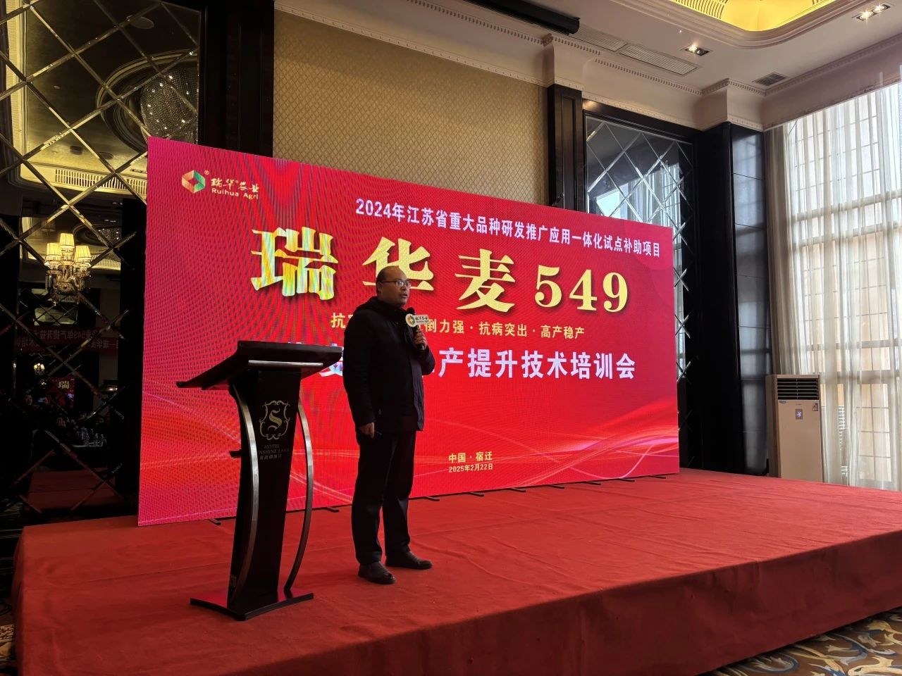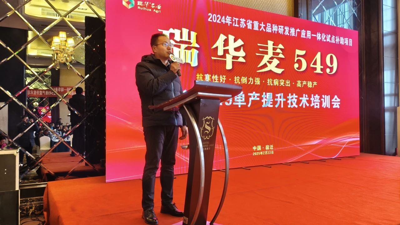 為深入推廣高產小麥新品種瑞華麥549的種植技術,助力糧食單產提升,2月22日,江蘇瑞華農業(yè)科技有限公司在宿遷市舉辦了“江蘇省重大品種研發(fā)推廣應用一體化試點補助項目——瑞華麥549高產栽培暨單產提升技術培訓會”。會議特邀宿遷市農技綜合服務中心副主任、推廣研究員何井瑞現場授課,吸引了一百余名種植大戶、農業(yè)合作社代表及農技人員參與,共同探討瑞華麥549高產高效種植的新路徑。